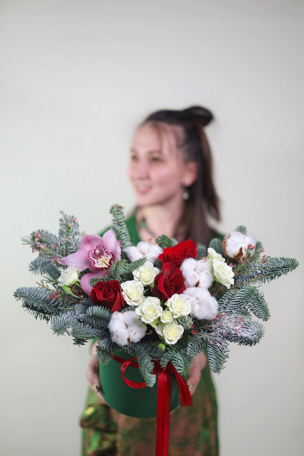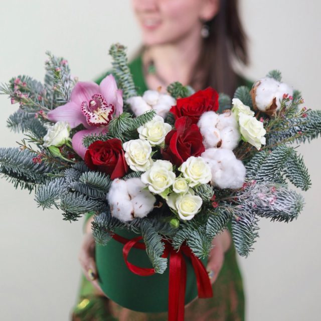 Композиция в зимнем стиле с датской елью нобилис, орхидеями, бордовыми пионовидными розочками, эвкалиптом.
