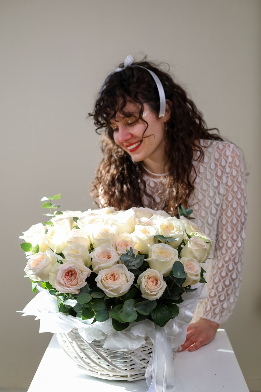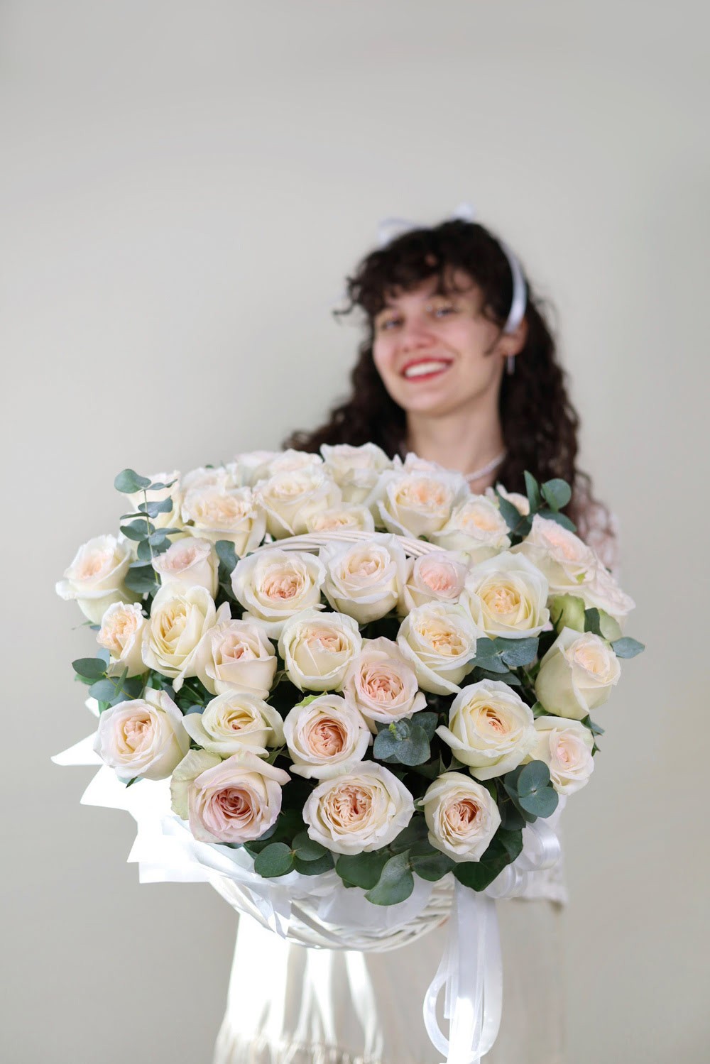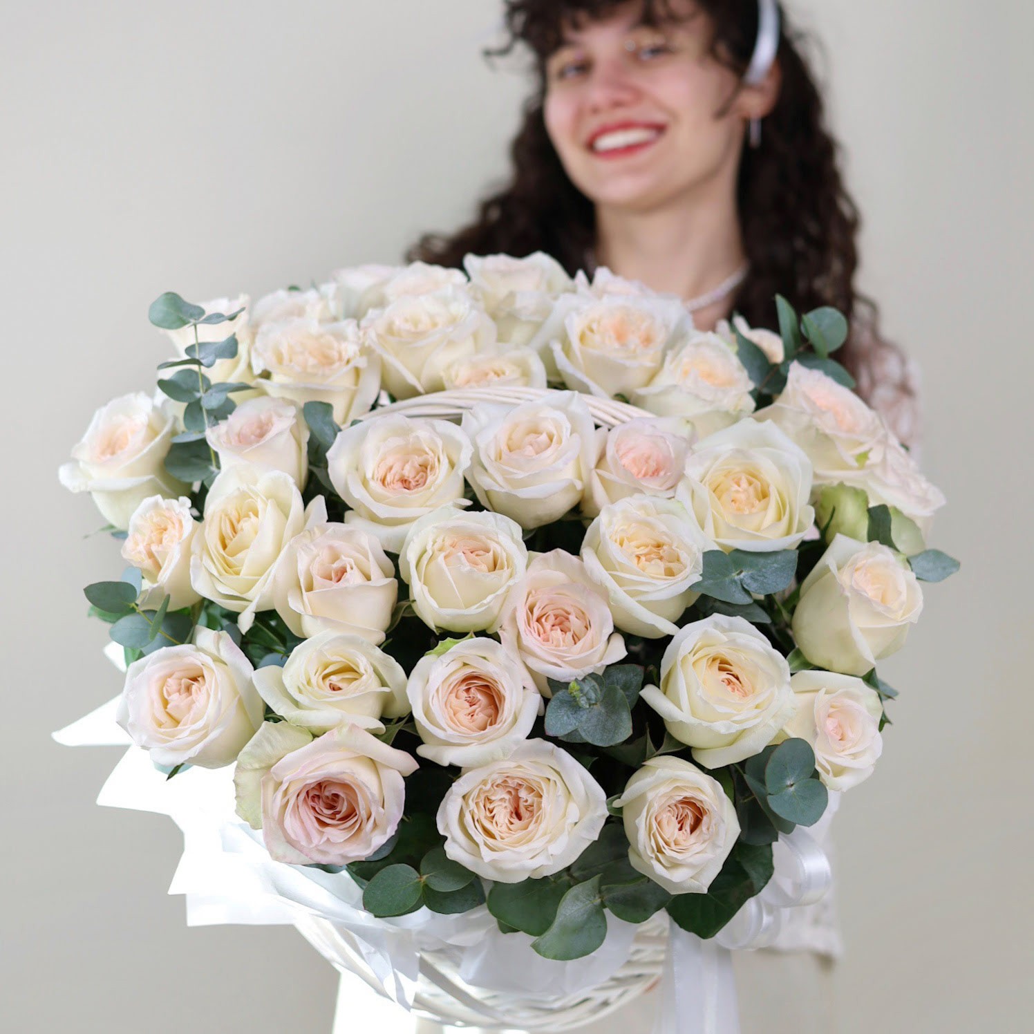 Роскошная композиция из пионовидных эквадорских роз сорта White O’Hara со сладким ароматом и эвкалиптом. Композиция выполнена в плетеной корзине и украшена атласными лентами.