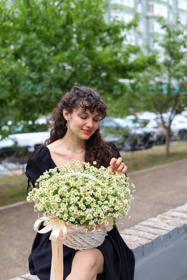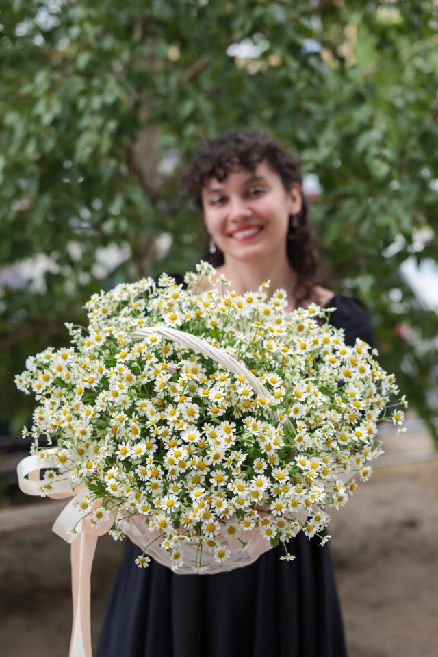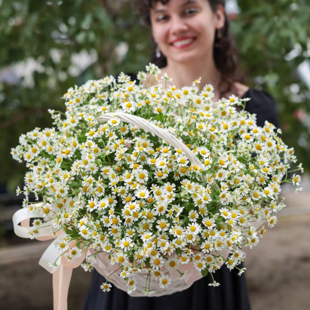 Корзина среднего размера, ширина композиции 30 – 35 см.
