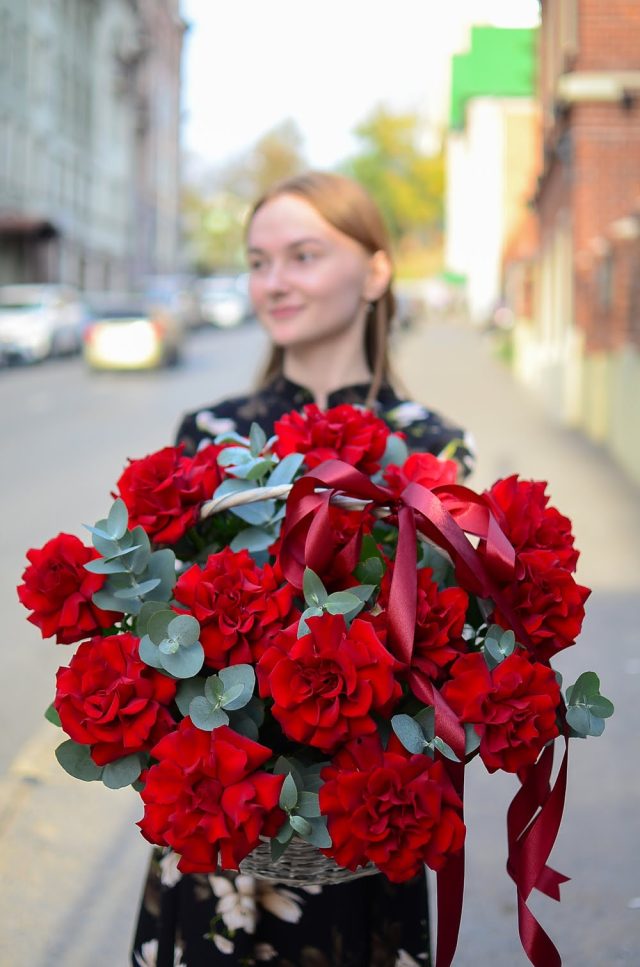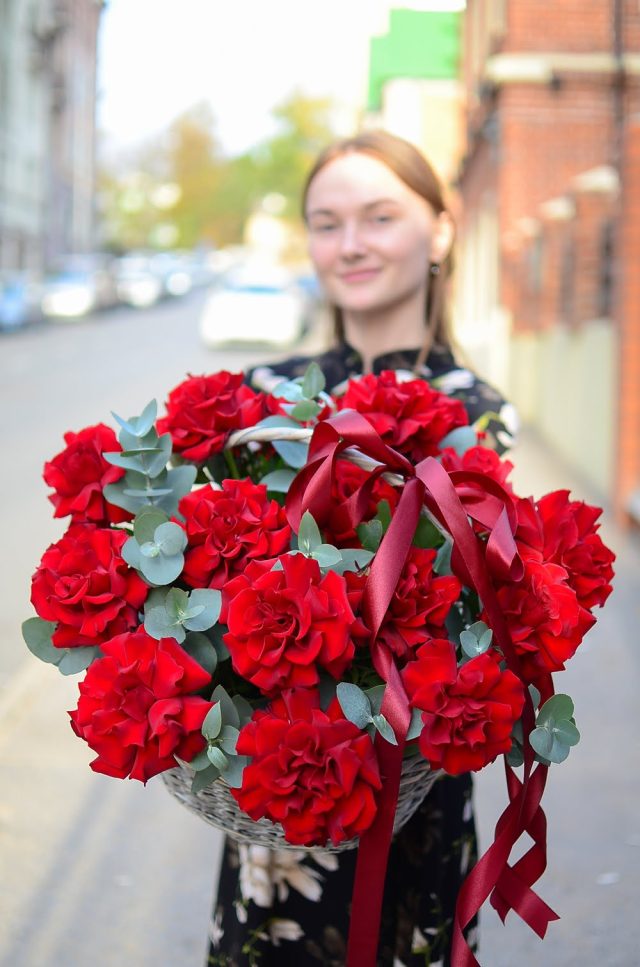 Великолепная композиция из 17-ти крупных французских роз и душистого эвкалипта в плетеной корзине. Композиция украшена атласными лентами.