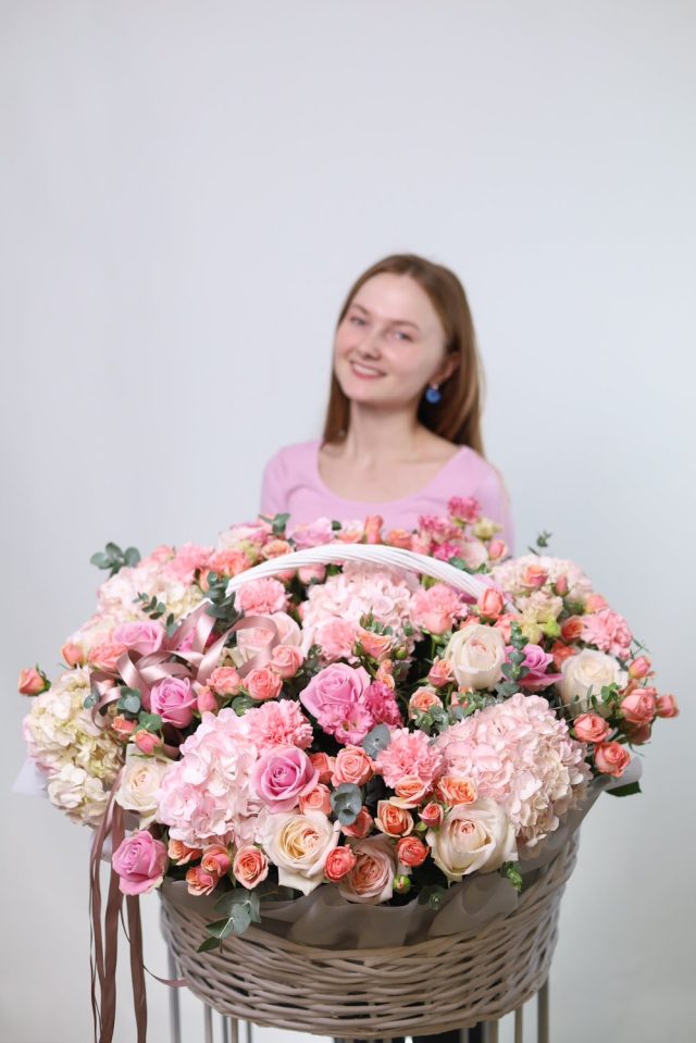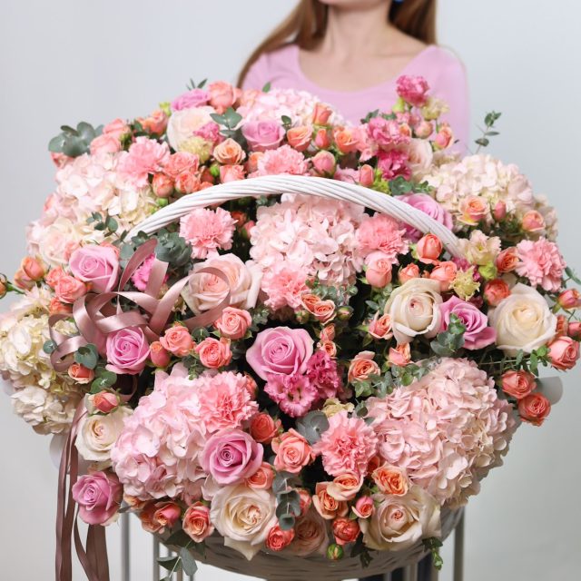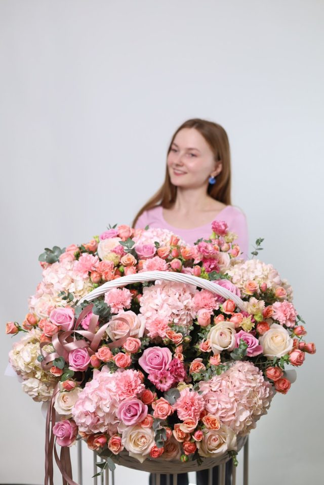 Состав: кустовые и одноголовые пионовидные розы, пышные гортензии, ажурная эустома, стойкие диантусы, одноголовые розы, эвкалипт.