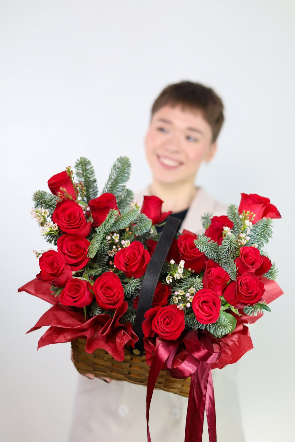 Корзина красных роз и нобилиса