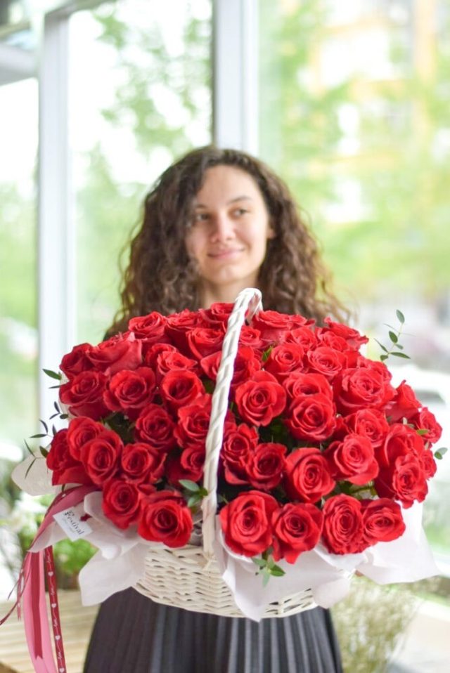 Красивая роскошная корзина из 51 розы с крупным бутоном и веточками эвкалипта.