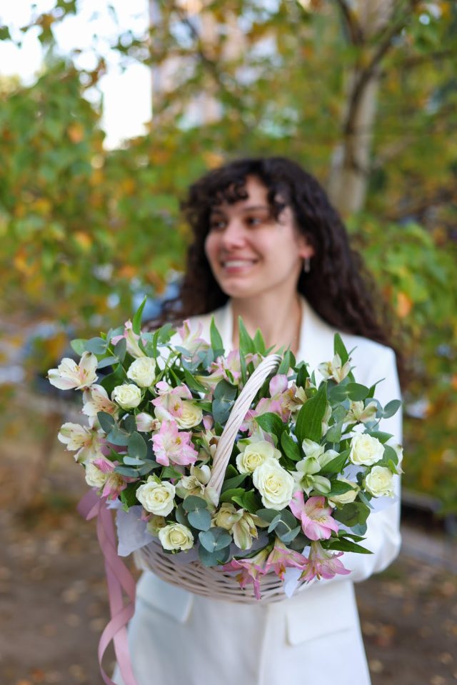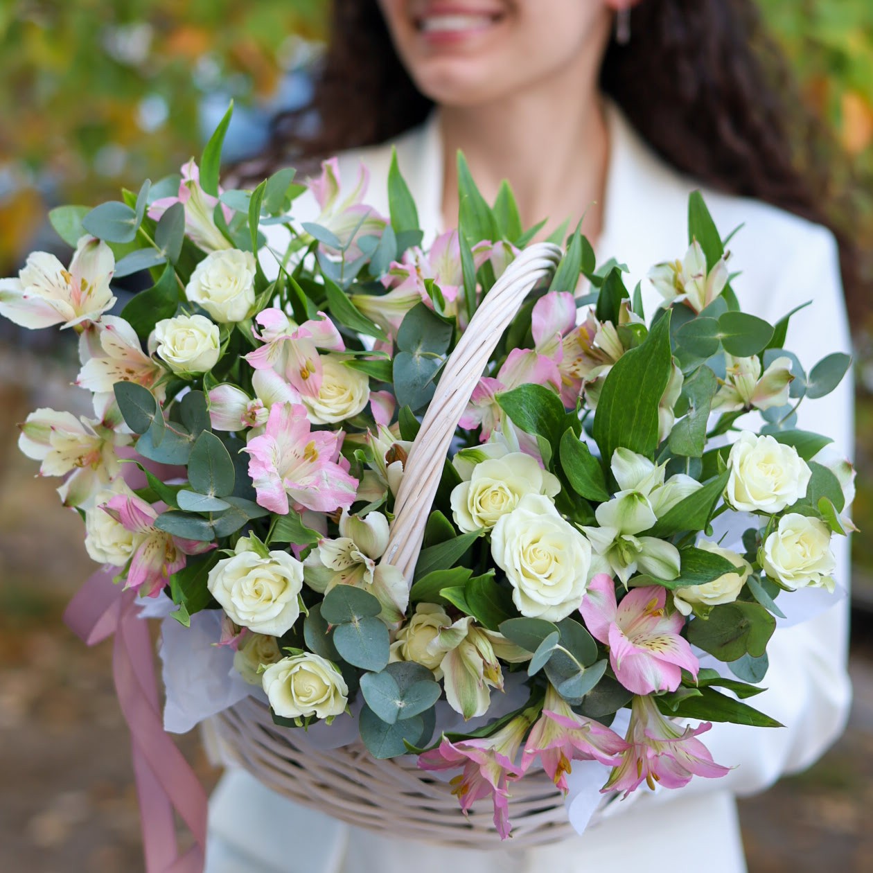Очаровательная корзина альстромерий и кустовой розы с ароматным эвкалиптом. Диаметр около 30 см.