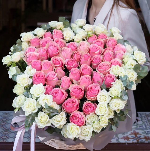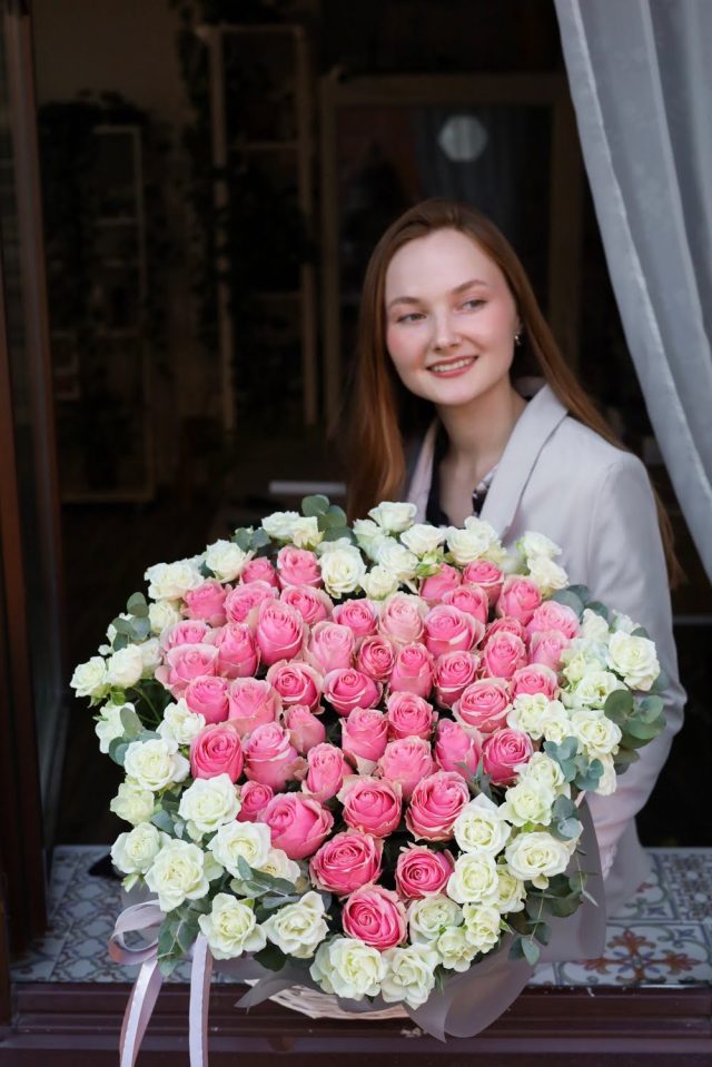 Роскошная композиция из одноголовых и кустовых роз с эвкалиптом, собранных в форме сердца.