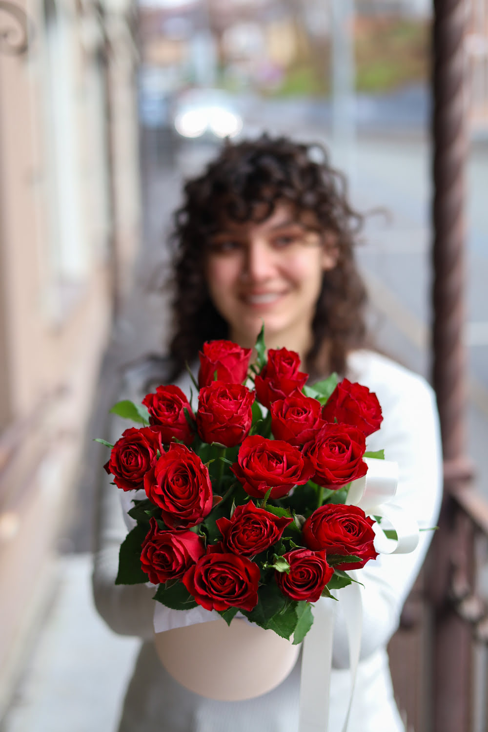 Прекрасная композиция из 15-ти красных роз в шляпной коробке.