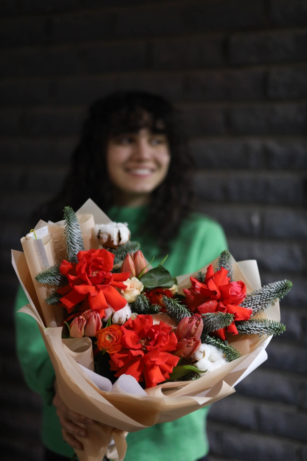Красочный букет с тюльпанами, крупными бордовыми розами, натуральным хлопком,пышными ветками датской ели.