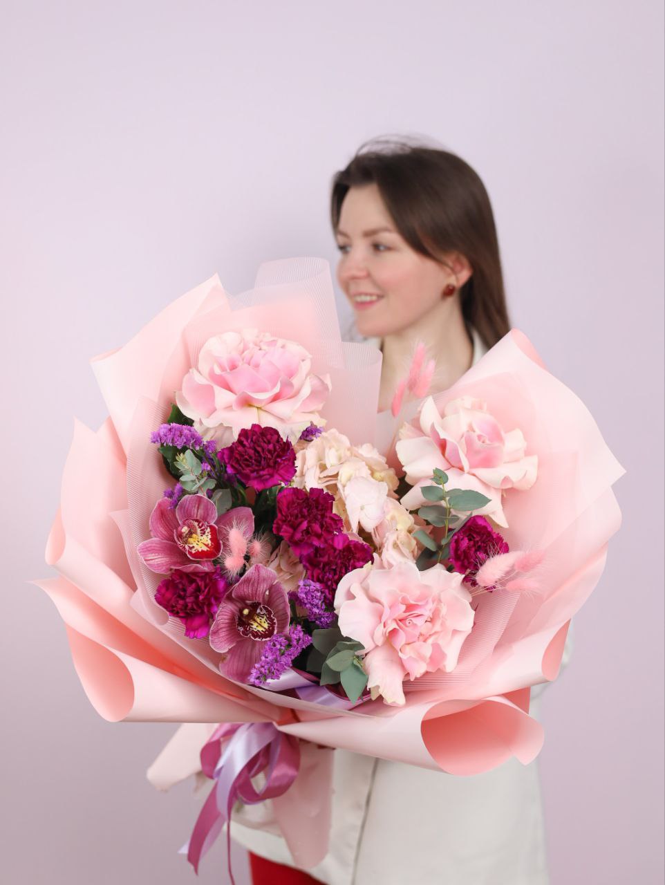 Состав: французская роза, орхидея, стойкий диантус, статица, пышная гортензия и душистый эвкалипт.