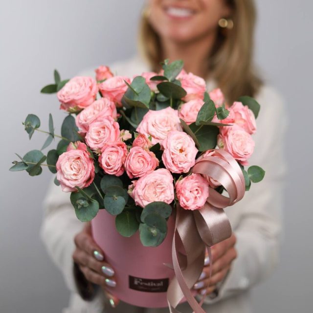 Очаровательные кустовые пионовидные розы с красивым бутоном и ароматным эвкалиптом в шляпной коробке.