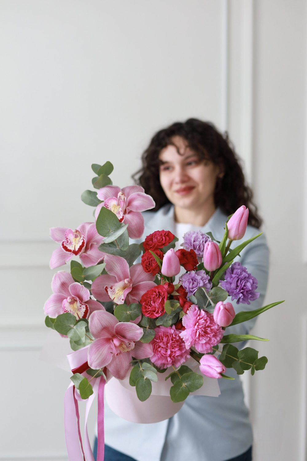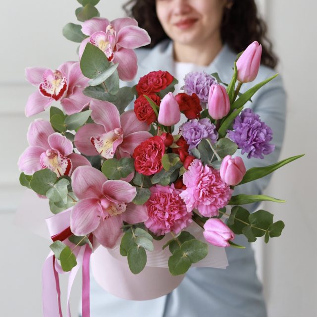 Состав: стойкие орхидеи и диантусы, тюльпаны, кустовые пионовидные розы, эвкалипт.