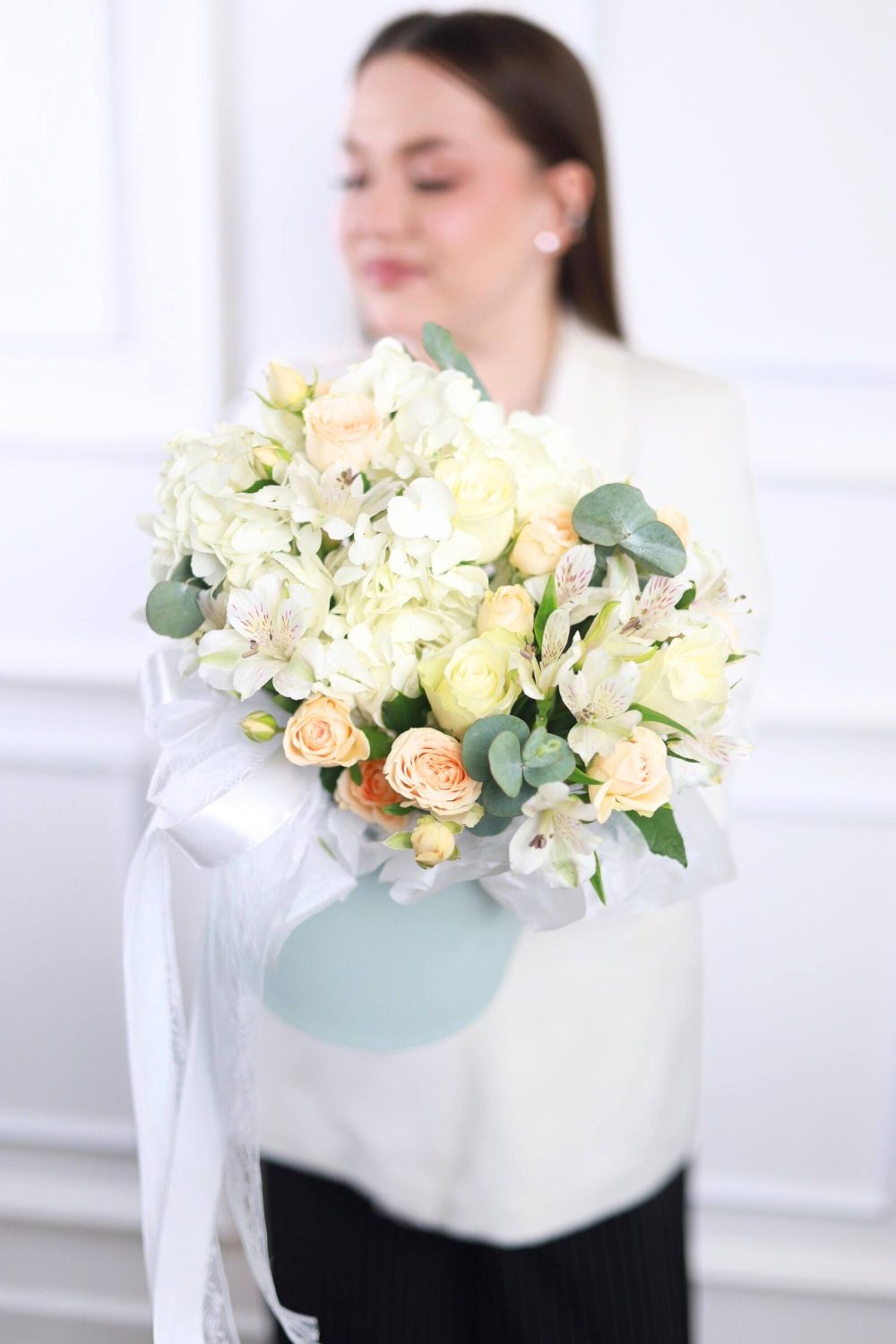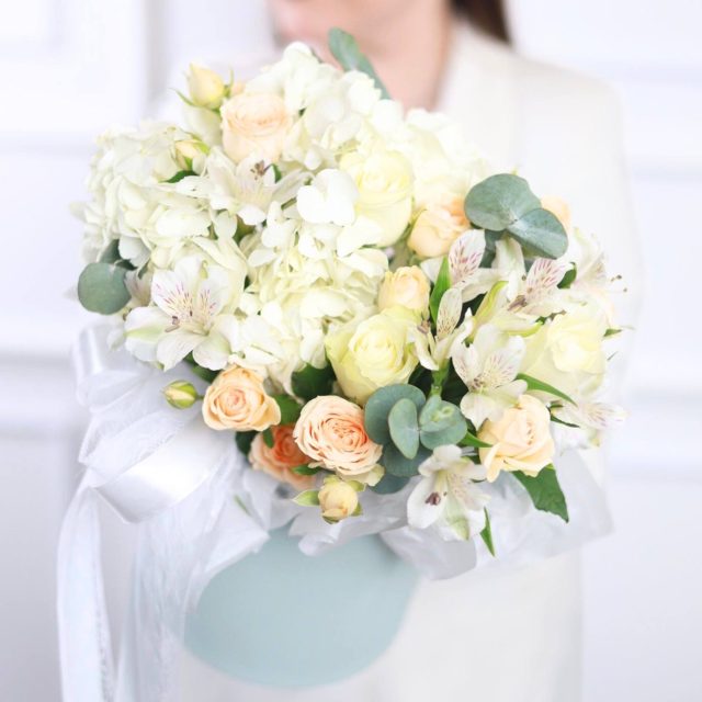 Состав: пышная гортензия, кустовые и одноголовые розы, стойкая альстромерия, эвкалипт.