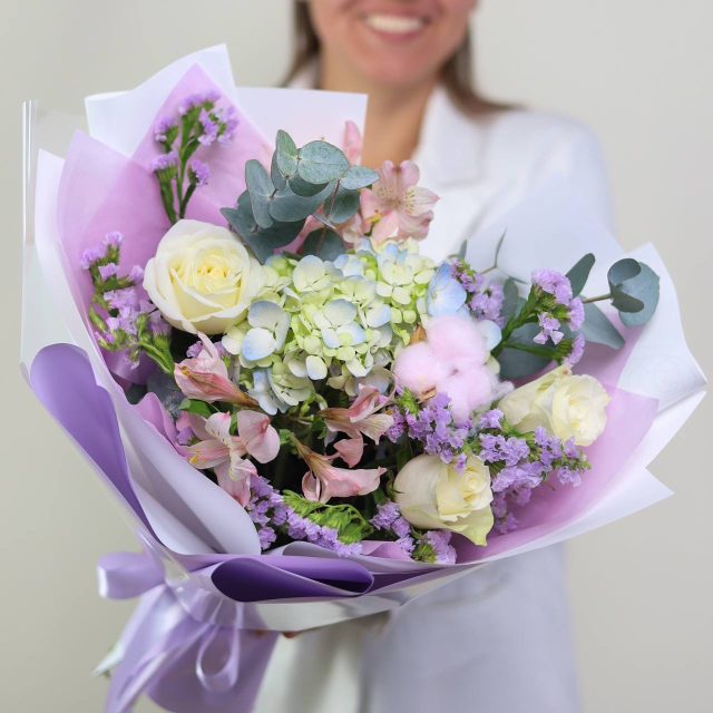Состав: гортензия, одноголовые розы, стойкая альстромерия, статица, эвкалипт, хлопок.