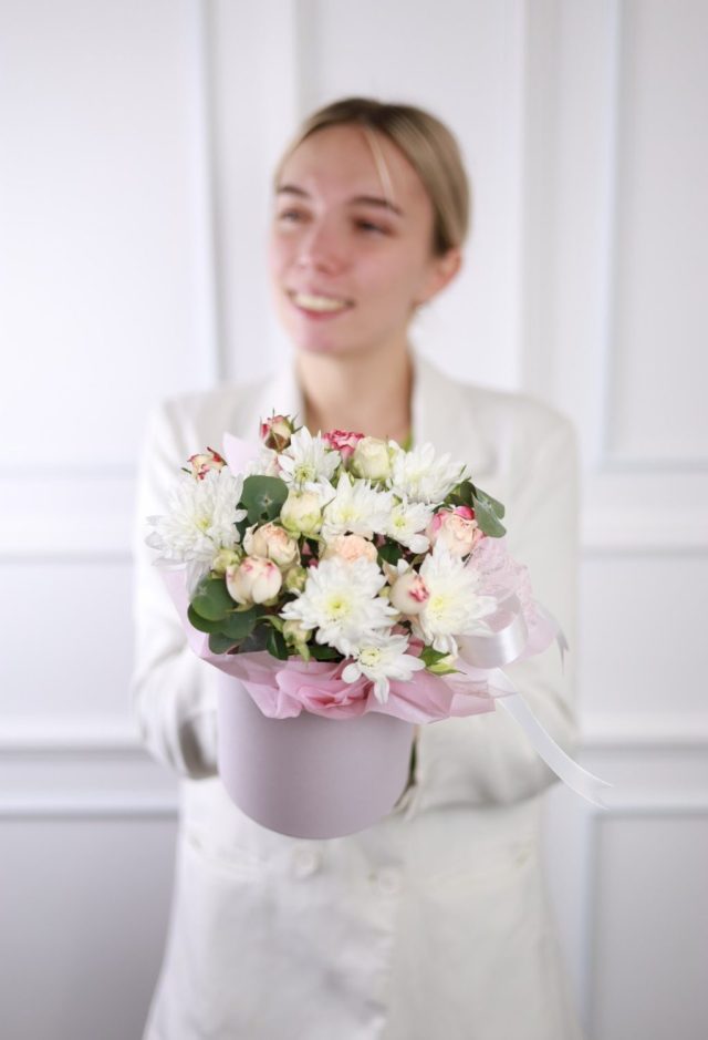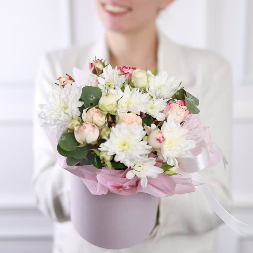 Композиция с пионовидной кустовой розой, хризантемой, и душистым эвкалиптом.