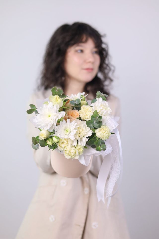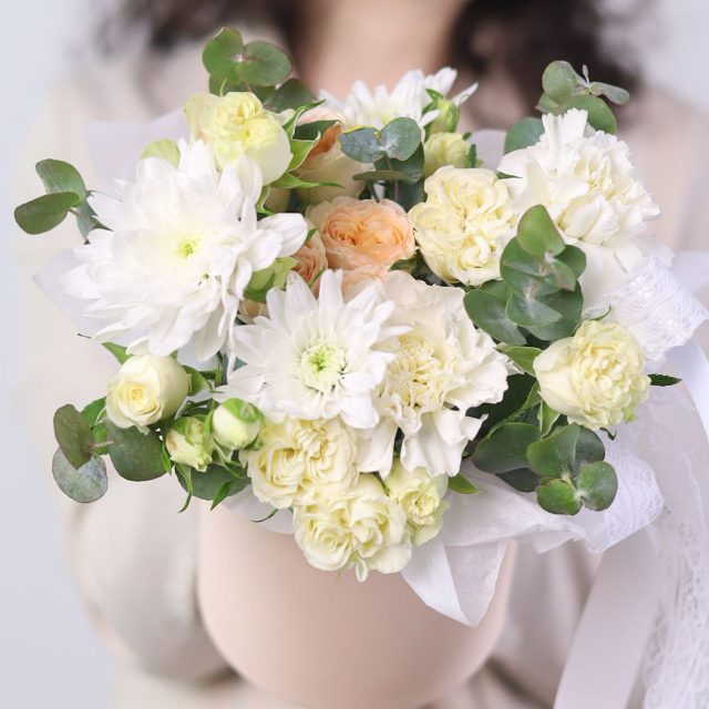 Композиция с пионовидной кустовой розой, хризантемой, стойким диантусом и душистым эвкалиптом.