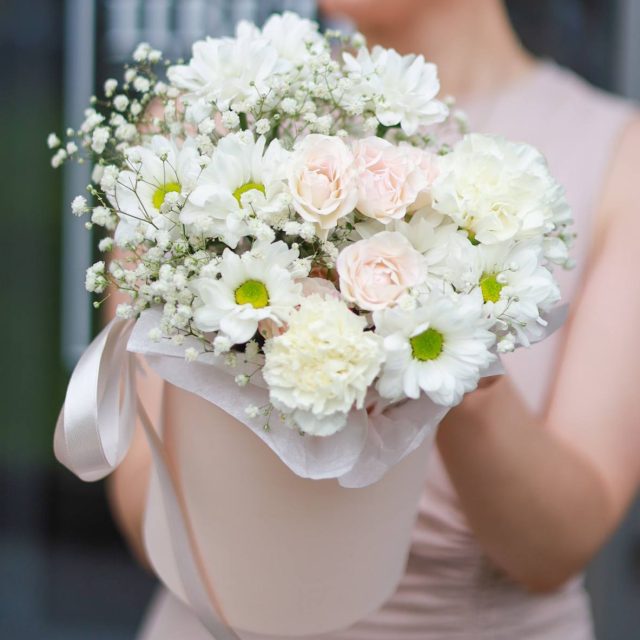 Состав: кустовые розы, стойкие диантусы, хризантема и гипсофила.