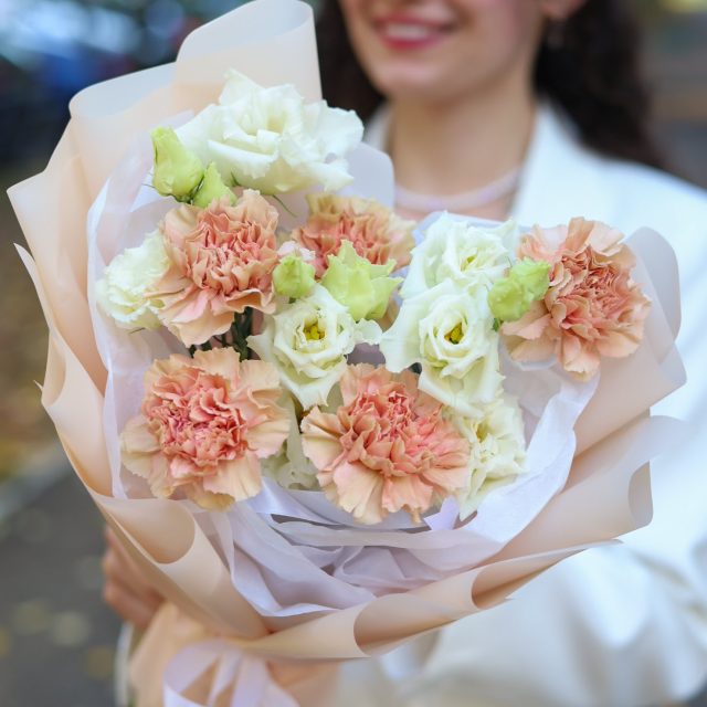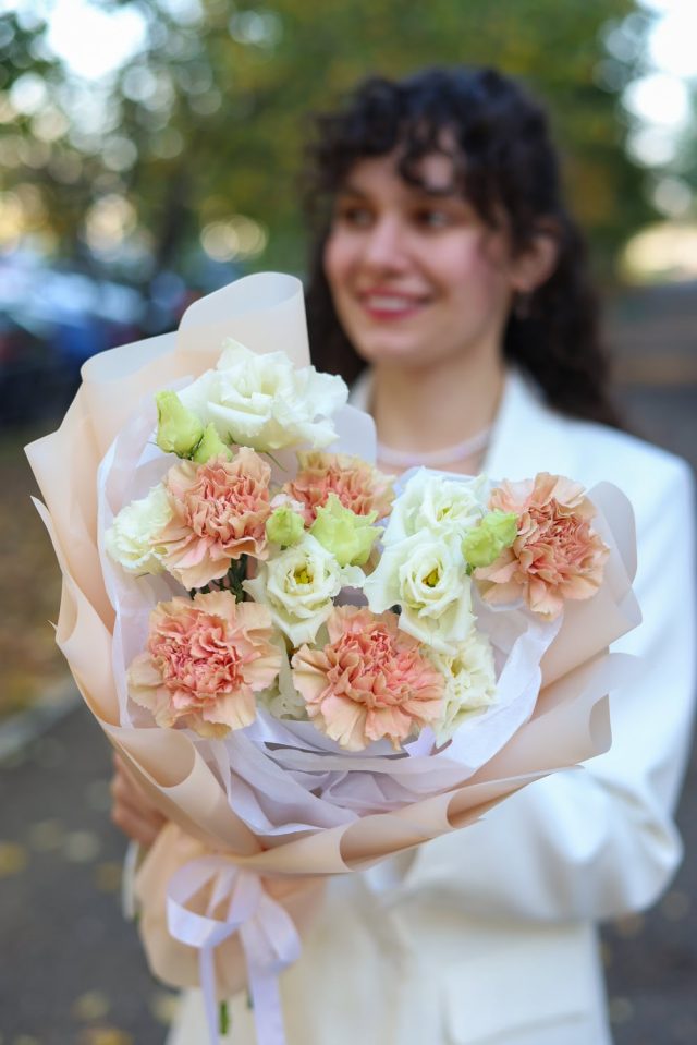 Очаровательный аккуратный букет с нежной эустомой и стойкими диантусами.