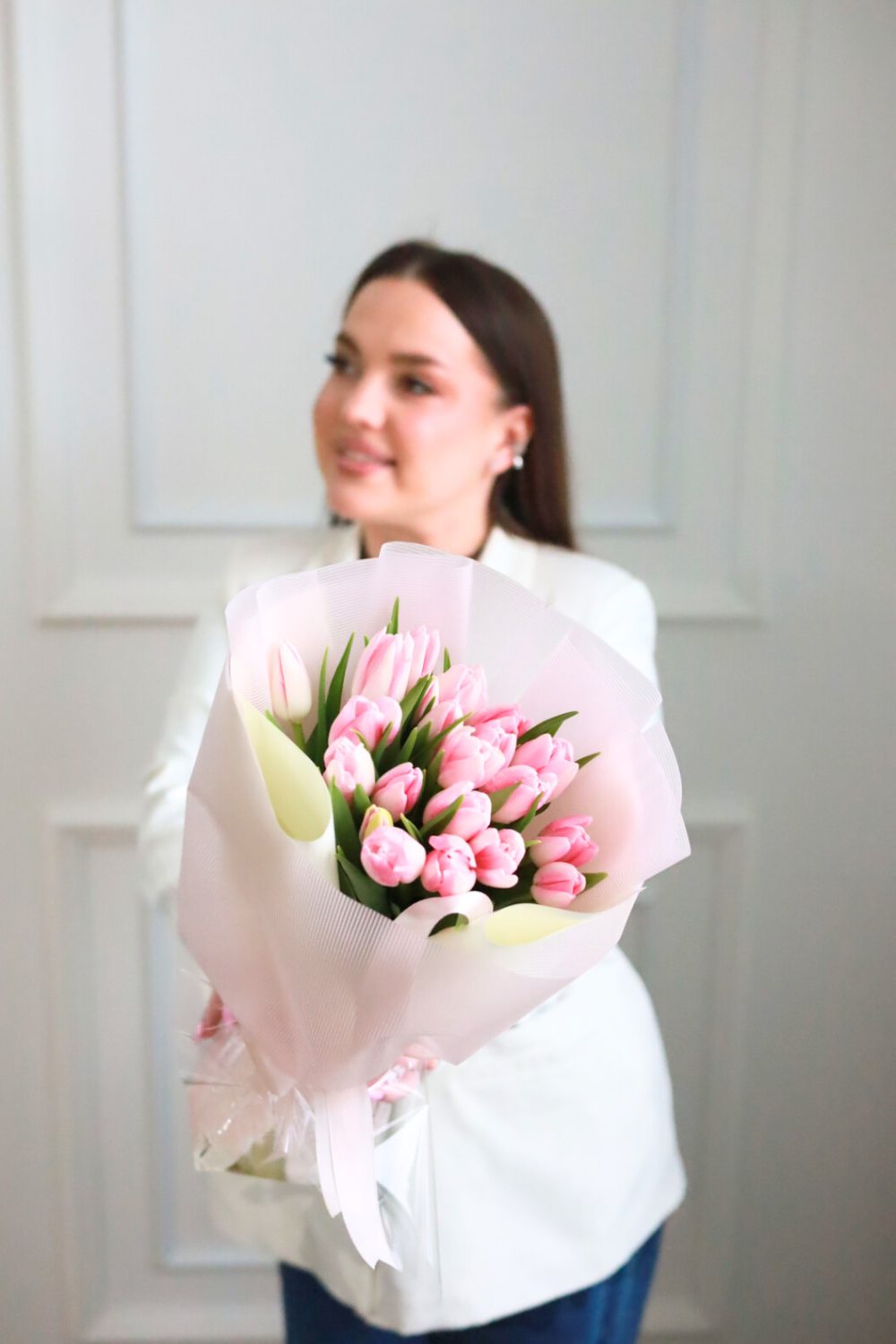 Очаровательный букет из 21-го тюльпана в оформлении.