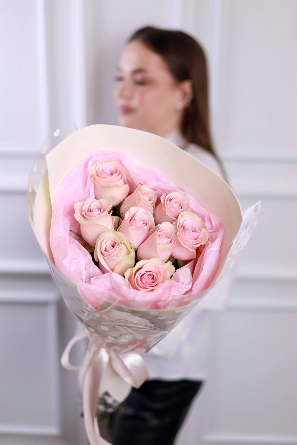 Очаровательный букет из 9 роз с крупным бутоном в оформлении.