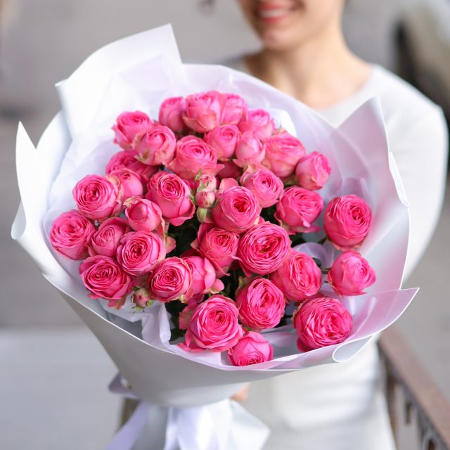 Очаровательный букет премиальных малиновых кустовых пионовидных роз с крупным бутоном в оформлении.