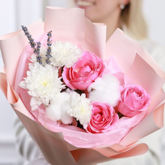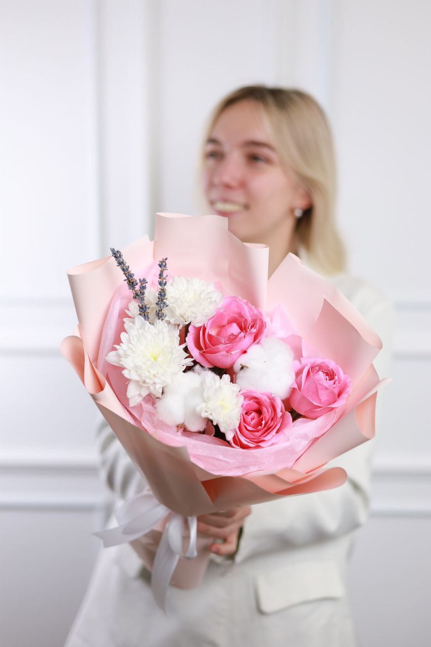 Букет с хризантемой, хлопком, розой и лавандой в оформлении.