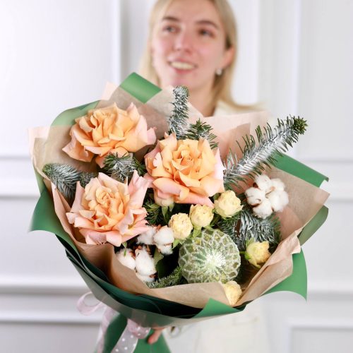 Букет в оформлении с крупной и кустовой розой, хлопком.