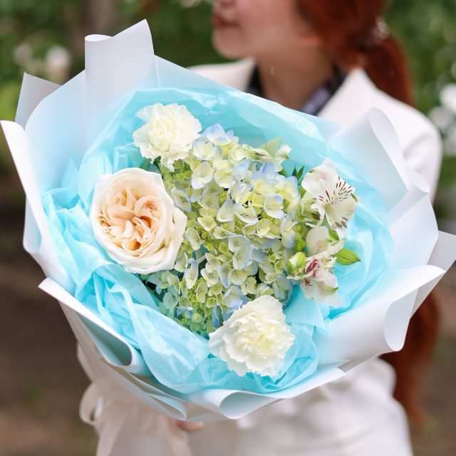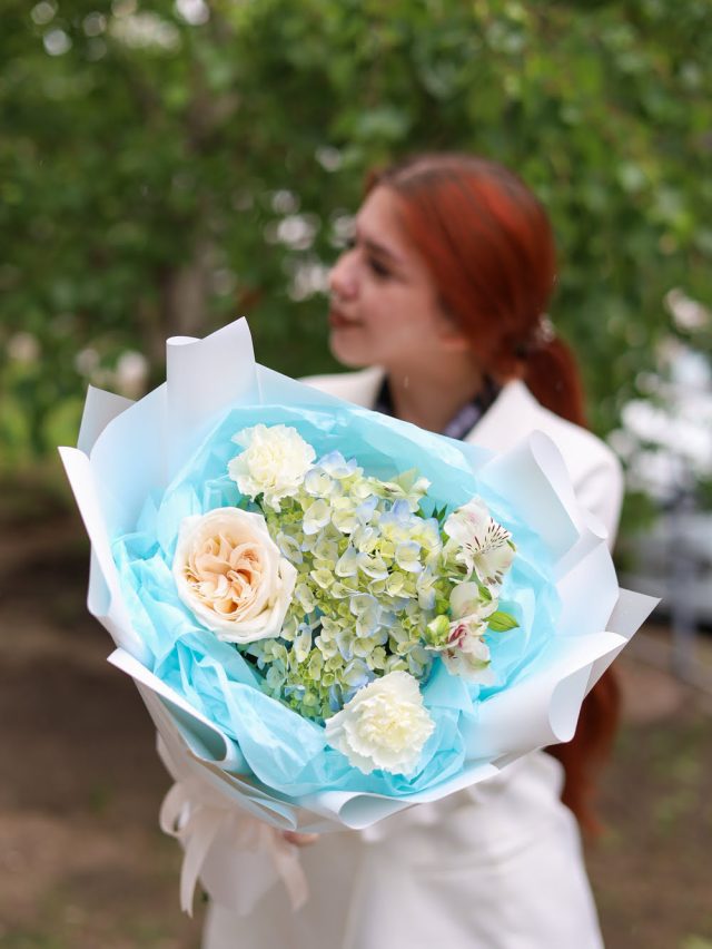 В составе: пышная гортензия, стойкие диантусы и альстромерия, пионовидная роза.