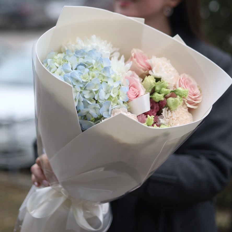 В составе букета: пышная гортензия, эустома, розы, хризантема