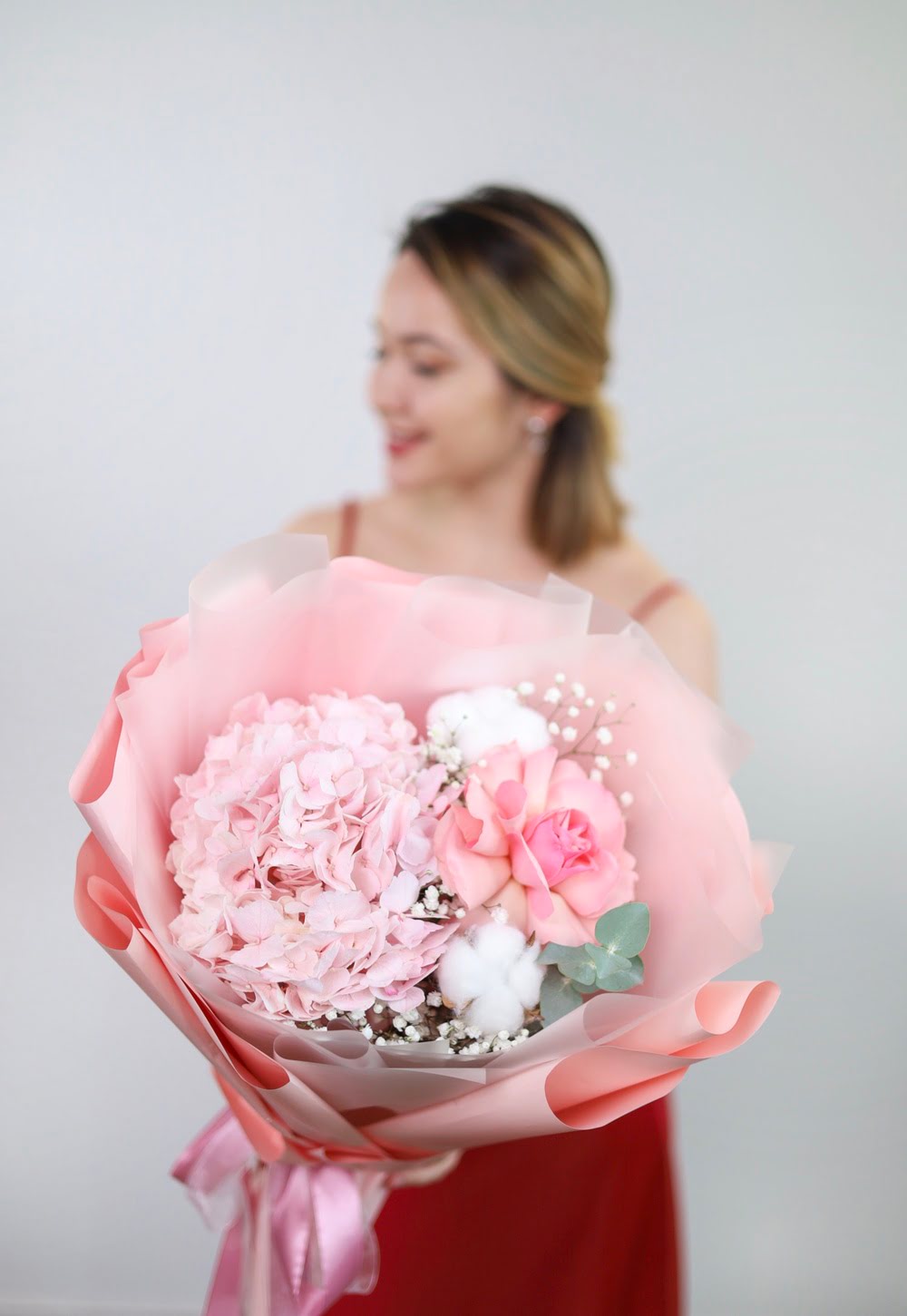 Состав: пышная гортензия, французская роза, хлопок, гипсофила, эвкалипт.