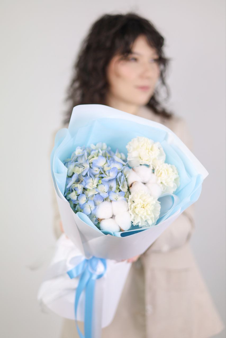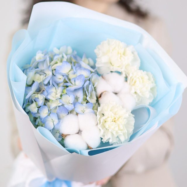 Букет с пышной гортензией, стойким диантусом и хлопком в оформлении.