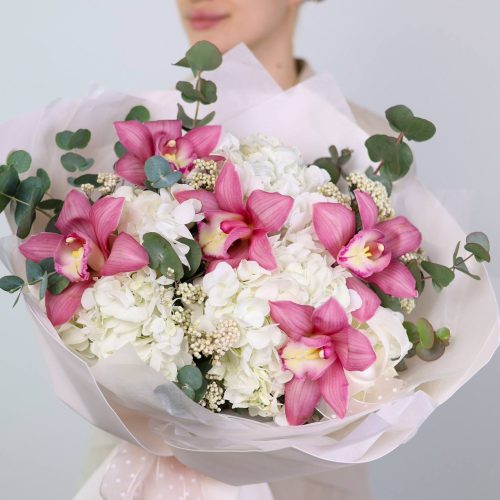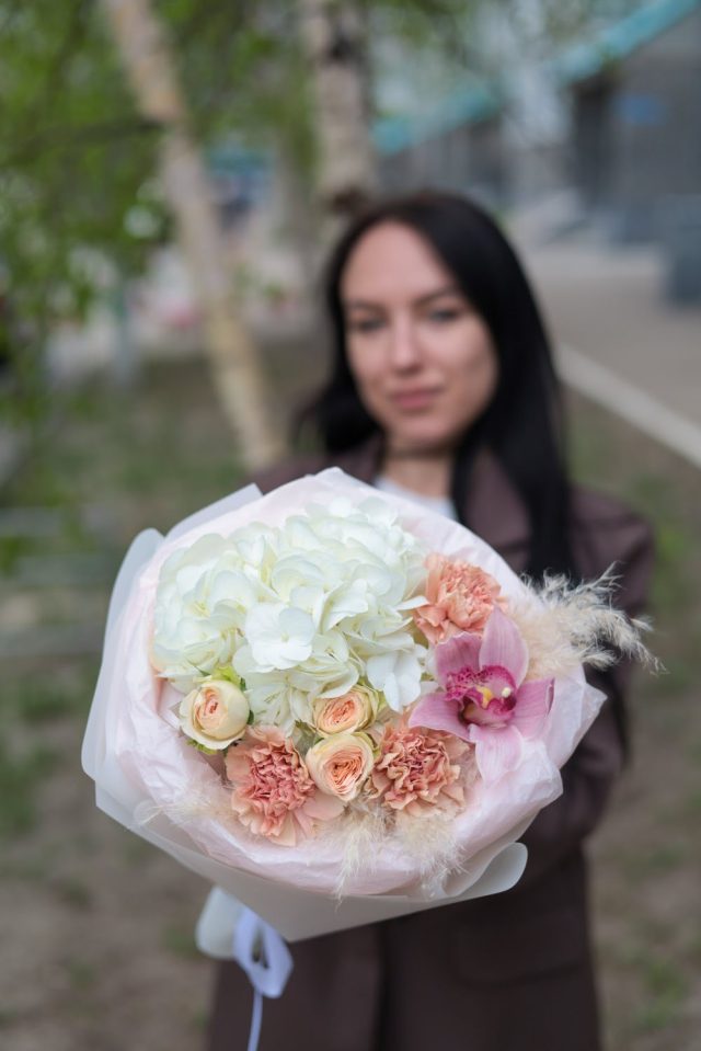 В букете: пышная гортензия, кустовые пионовидные розы, диантусы, орхидея, сухоцветы. Высота около 47 см.