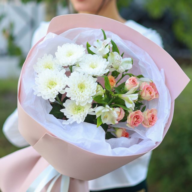 Состав: кустовые розы, стойкие хризантема и альстромерия.