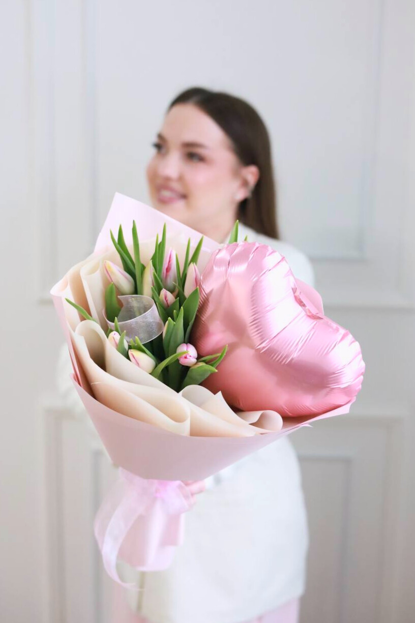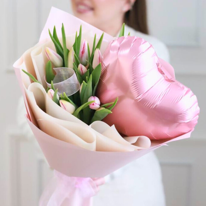 Нежный букет с тюльпанами и шаром в оформлении.