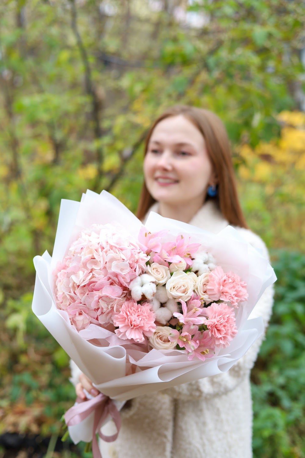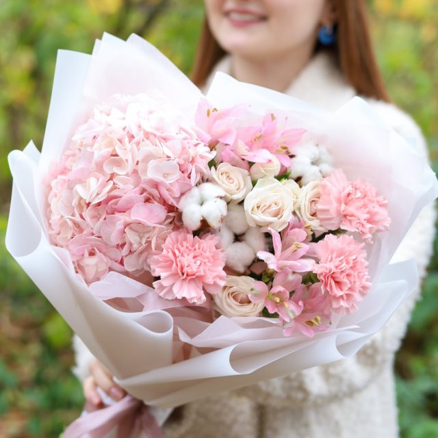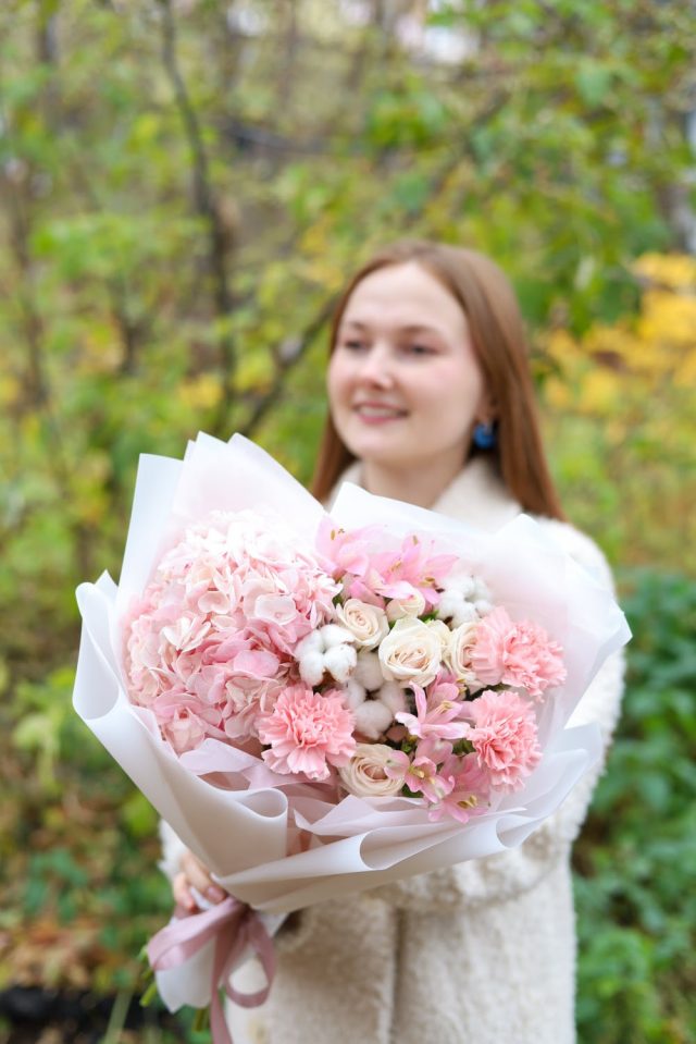 В букете: пышная гортензия, кустовые розы, стойкие диантусы и альстромерия, хлопок.