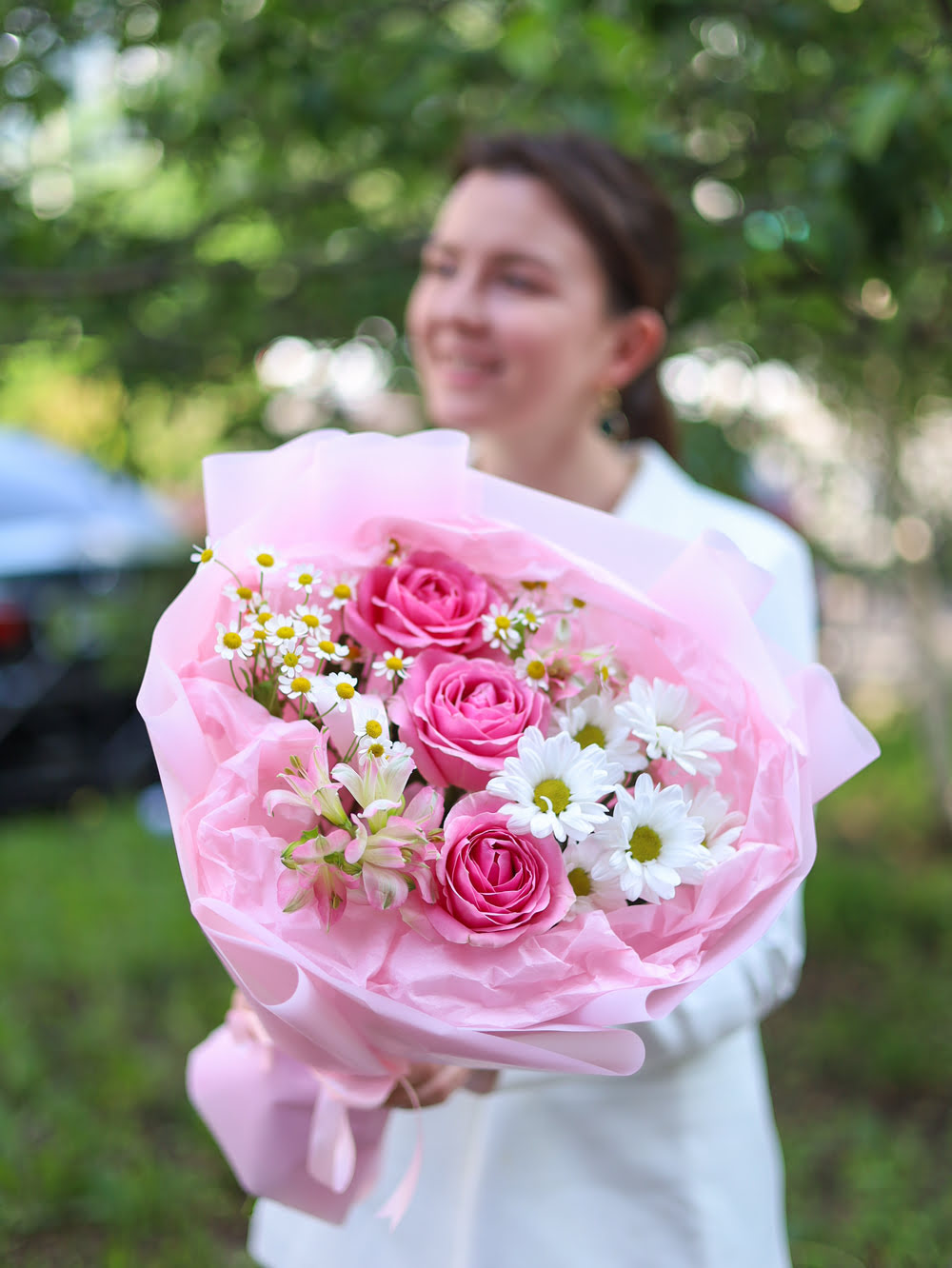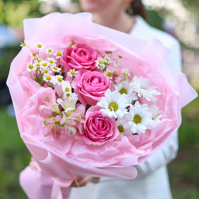 В букете: хризантема, альстромерия, одноголовые розы и ароматные ромашками.