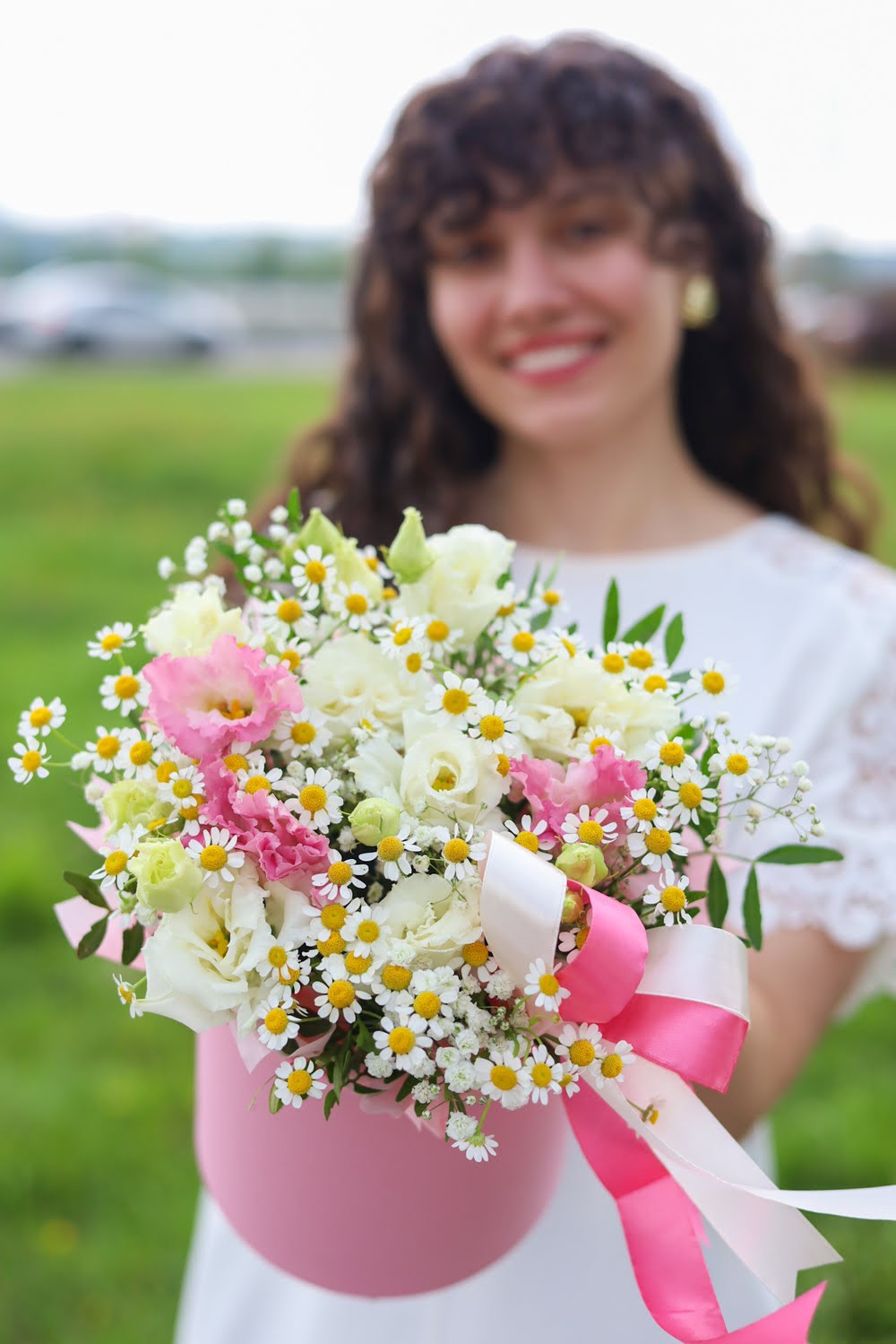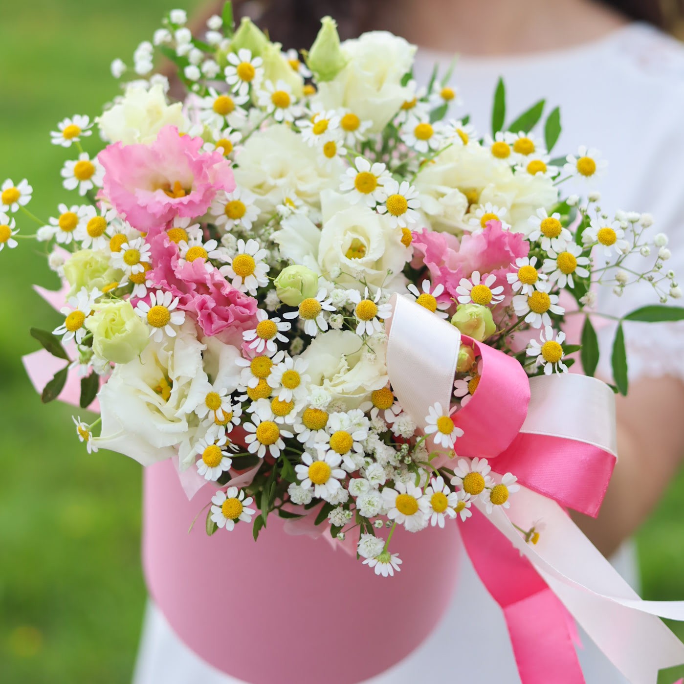 Очаровательная композиция из ароматных ромашек и ажурной эустомы в шляпной коробке.