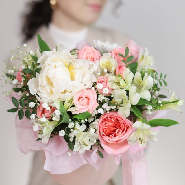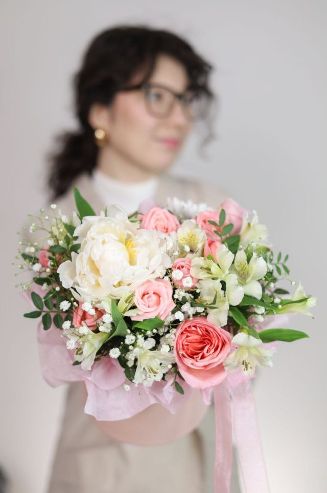 Композиция в нежной гамме с пионом, альстромерией, розой, стойкой гипсофилой и зеленью в шляпной коробке.