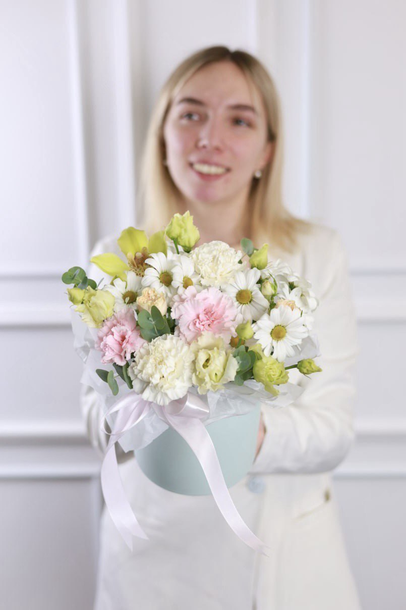 Весенняя композиция в нежной гамме со стойкими цветами в шляпной коробке