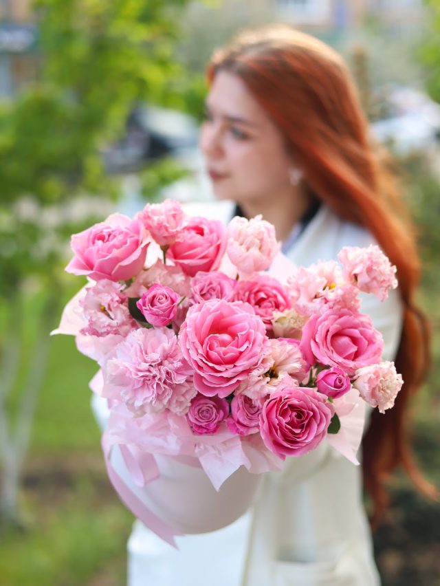 Очаровательная композиция в нежно-розовой гамме в шляпной коробке.
