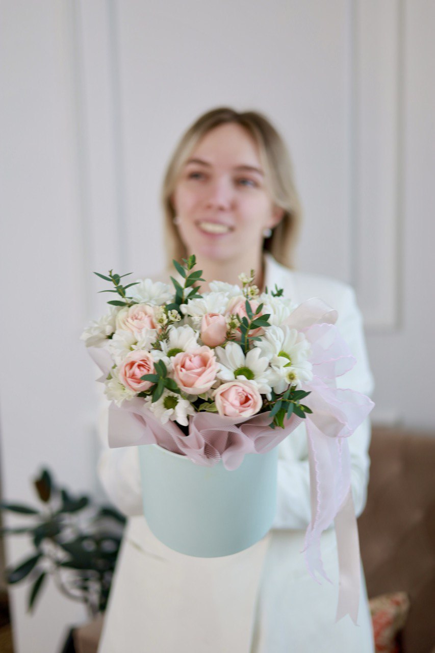 Красивая композиция с хризантемами, кустовыми розочками, хаммелациумом и зеленью в шляпной коробке.