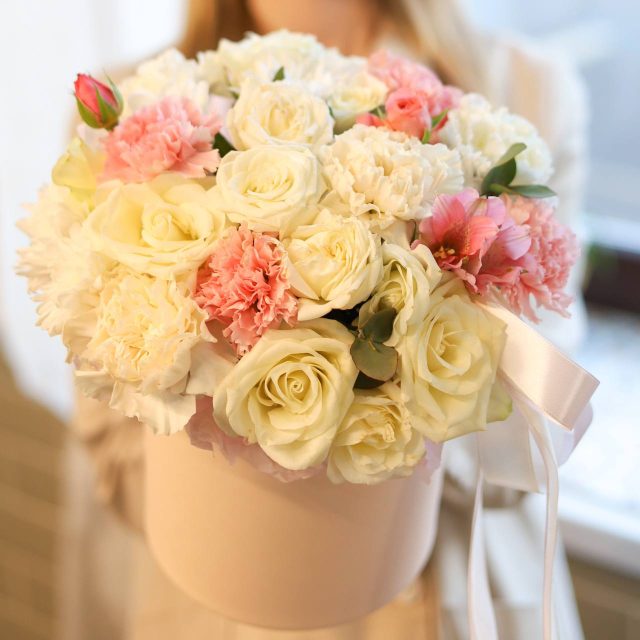 Композиция роз, диантусов и душистого эвкалипта в шляпной коробке.
