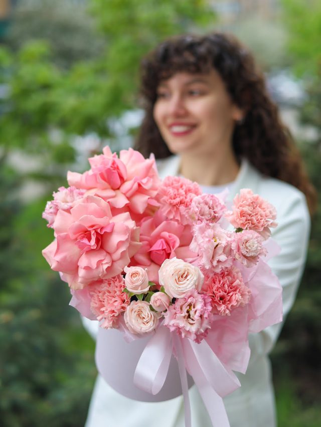 Состав: французские розы, стойкие диантусы, ажурная эустома, кустовые пионовидные розы.