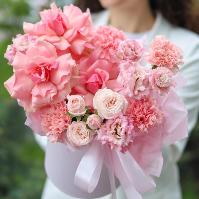 Прекрасная композиция в нежнейшей розовой гамме в шляпной коробке.