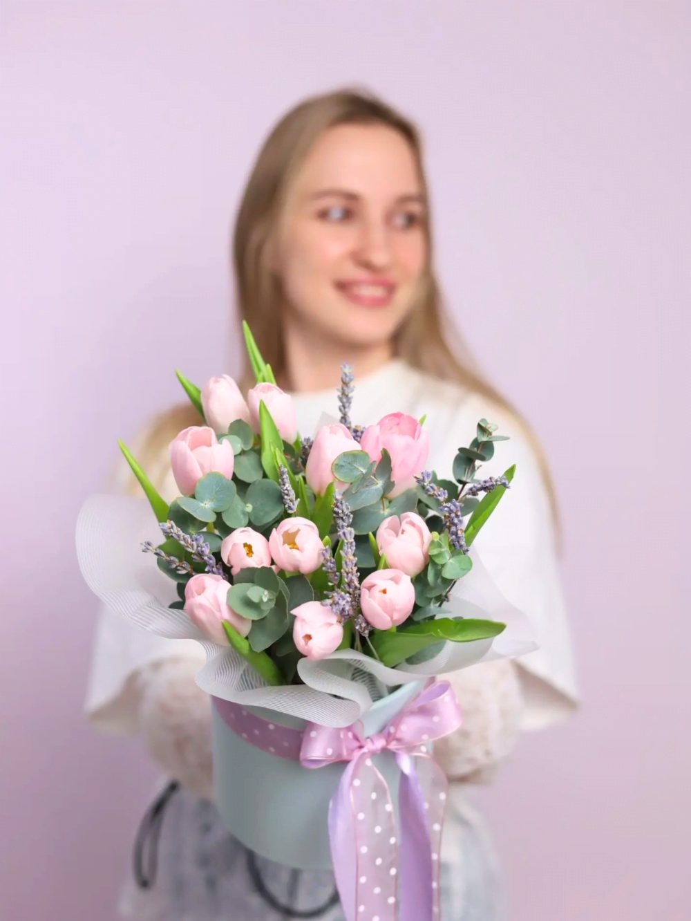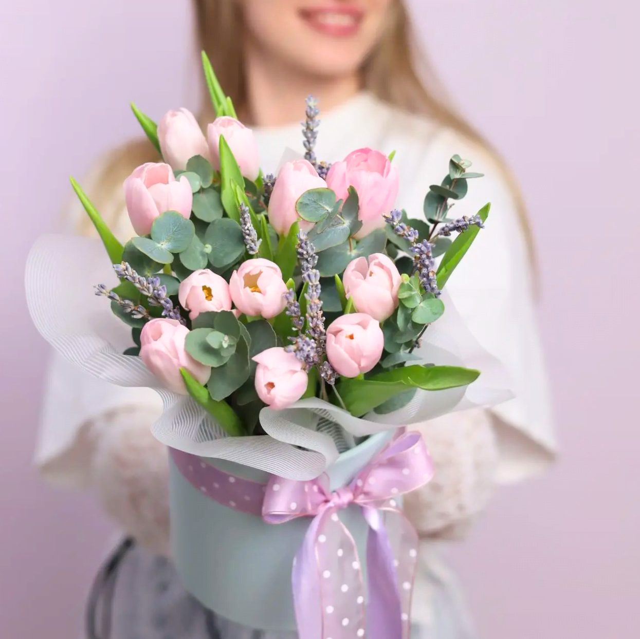 Нежные тюльпаны в шляпной коробке