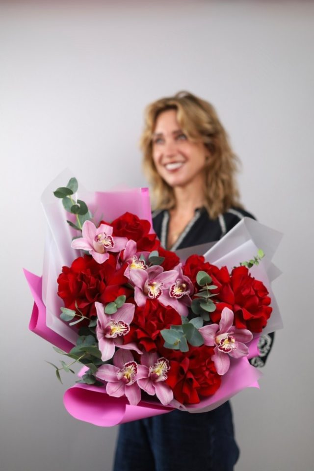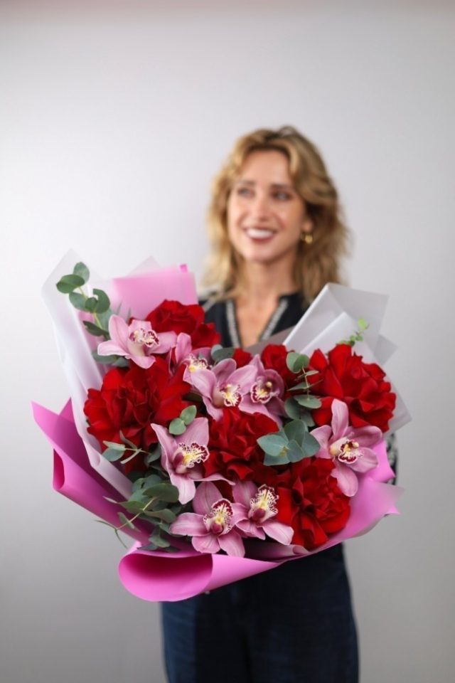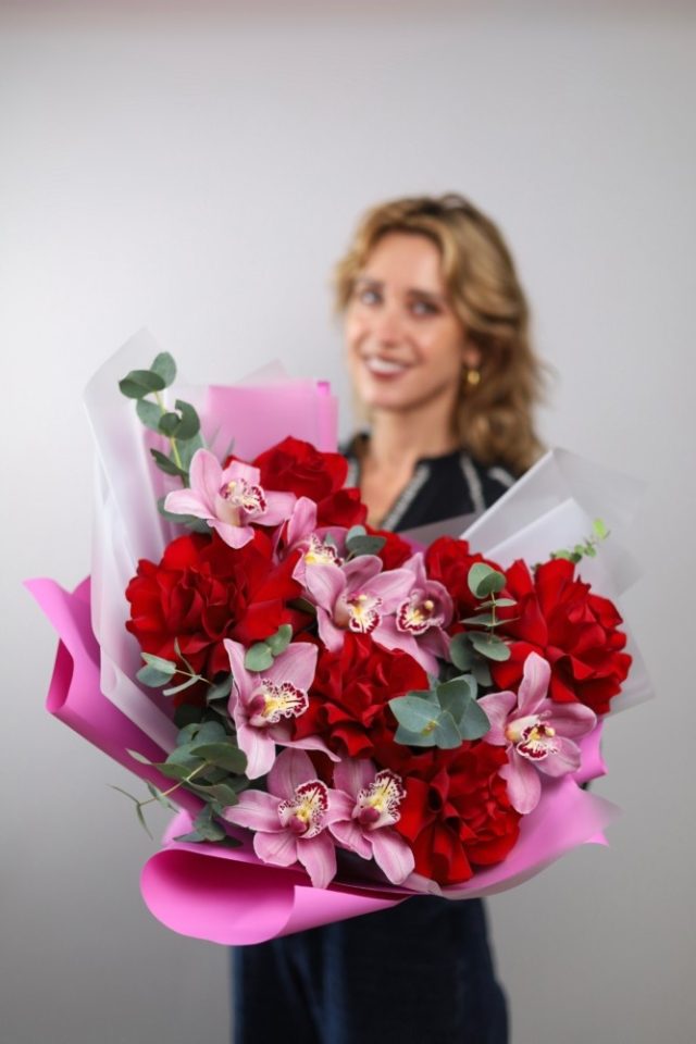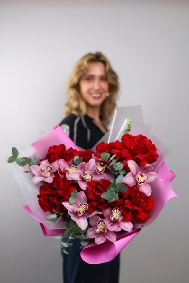 Объемный букет орхидей и французских роз