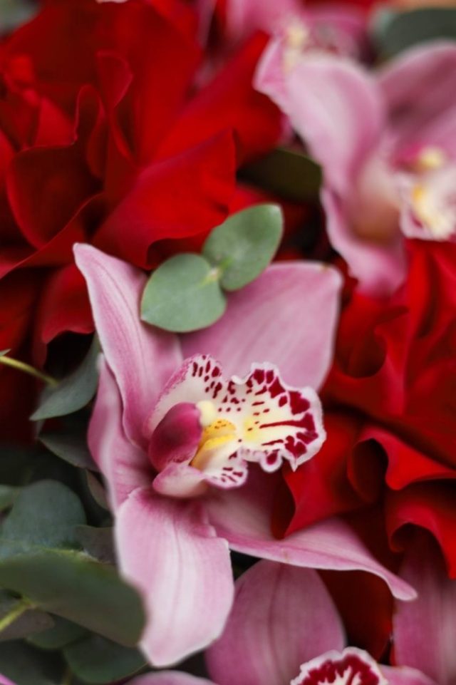В букете: крупные французские розы, стойкие орхидеи, ароматный эвкалипт.