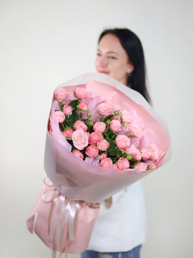 Букет крупных кустовых пионовидных роз нежного розового оттенка в стильном оформлении.