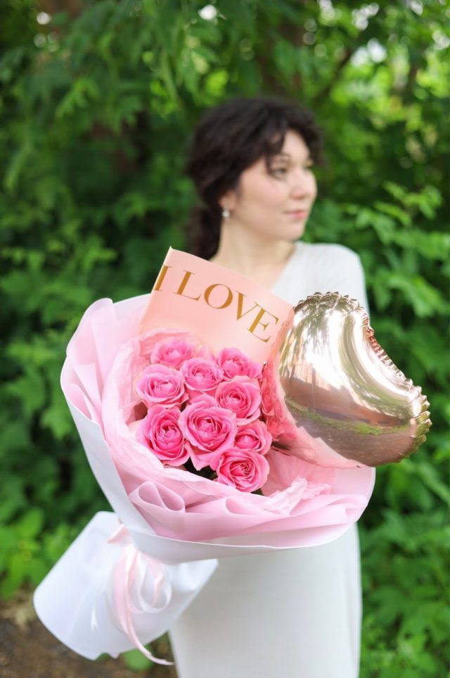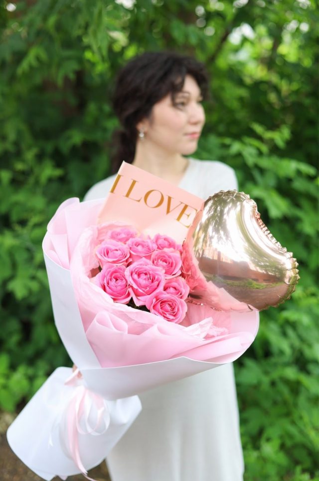Очаровательный букет из 9-ти нежно-розовых роз с шариком в виде сердца.
