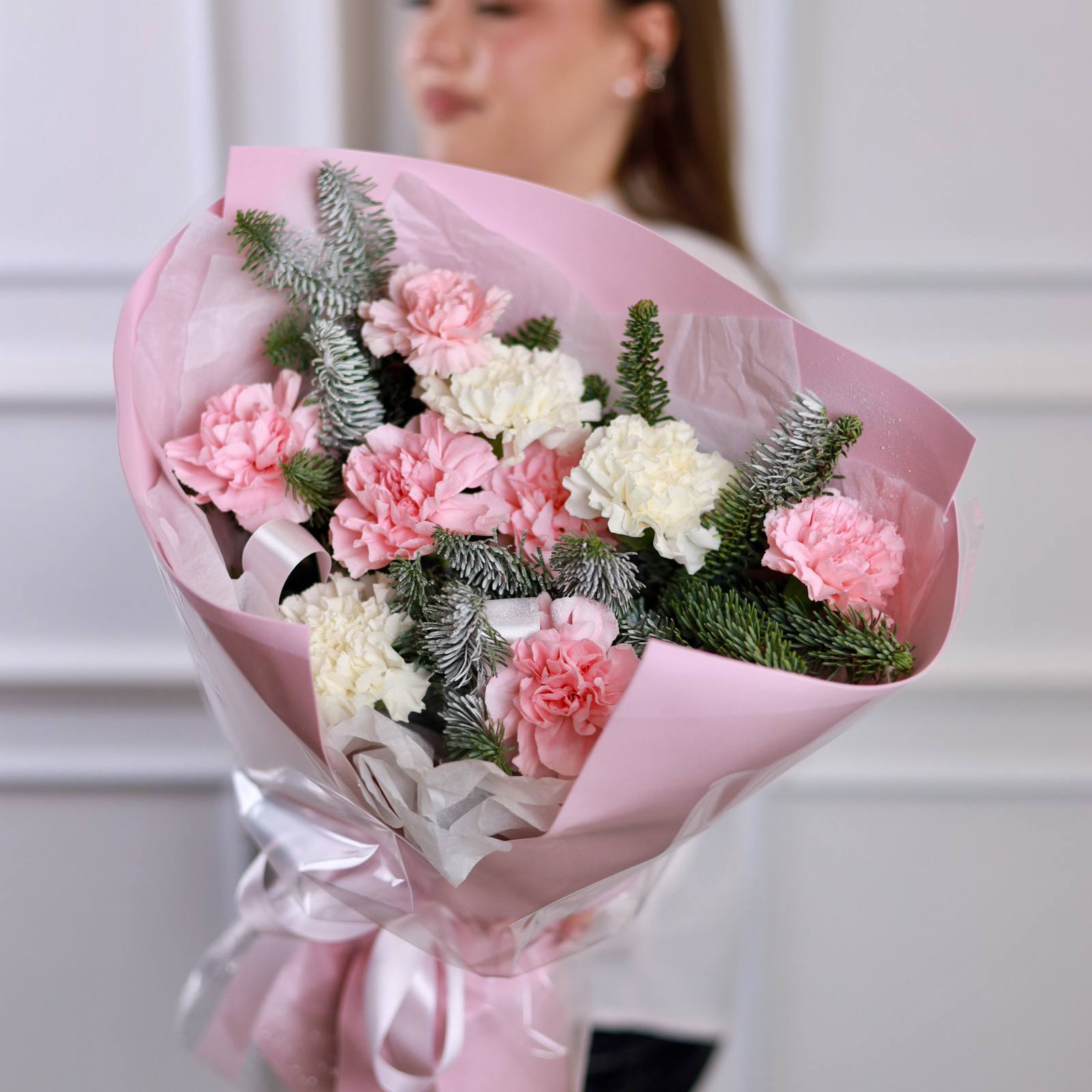 Пушистый и нежный букет с веточками датской ели и диантусами.