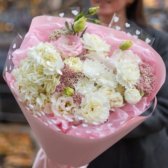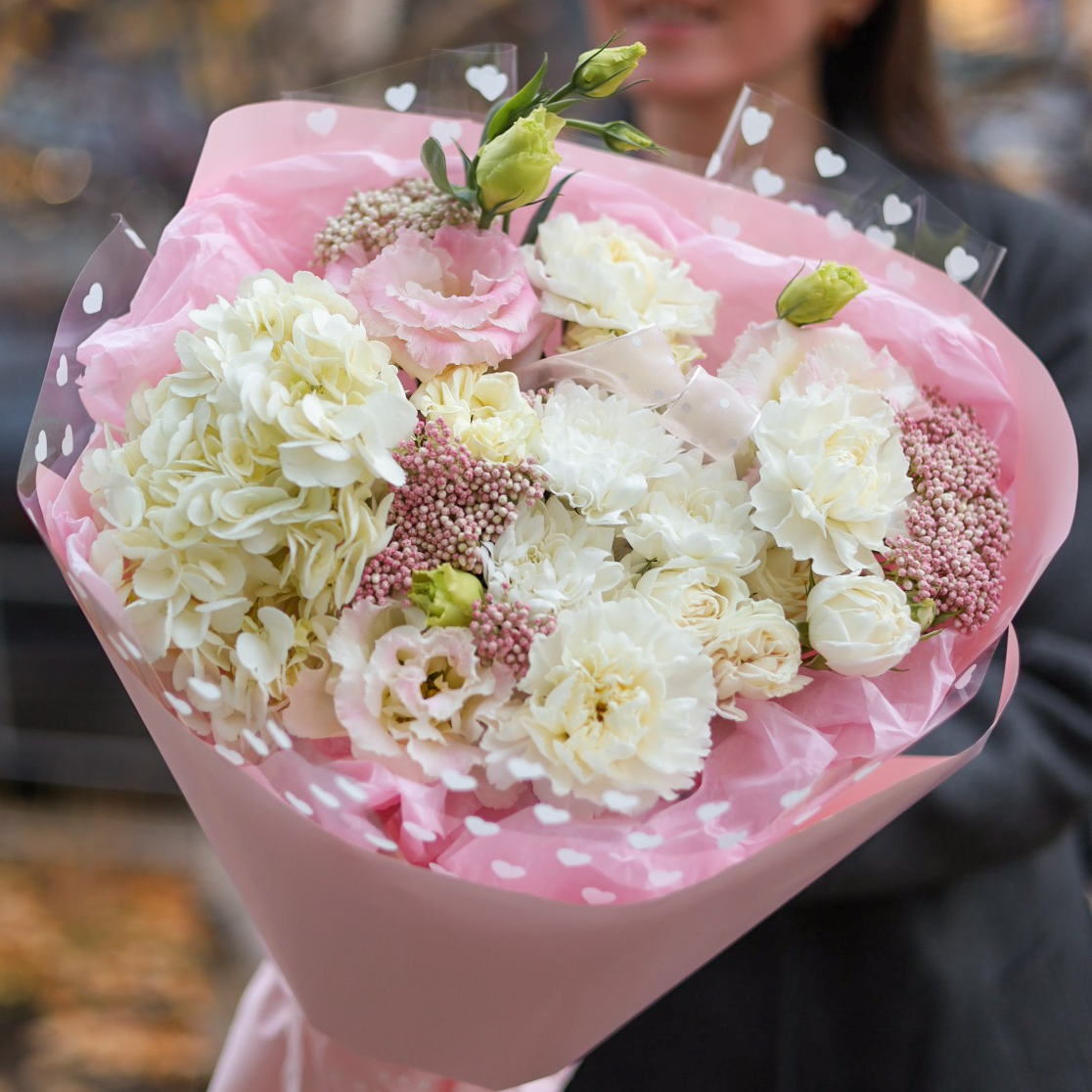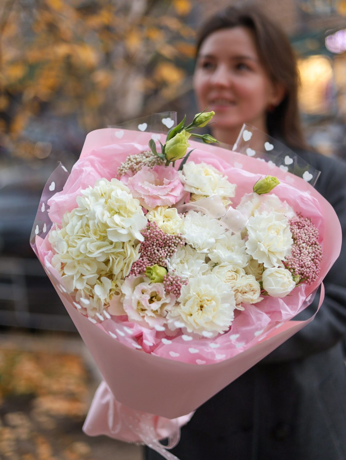 Букет с эустомой, гортензией, диантусами, хризантемой и озотамнусом.