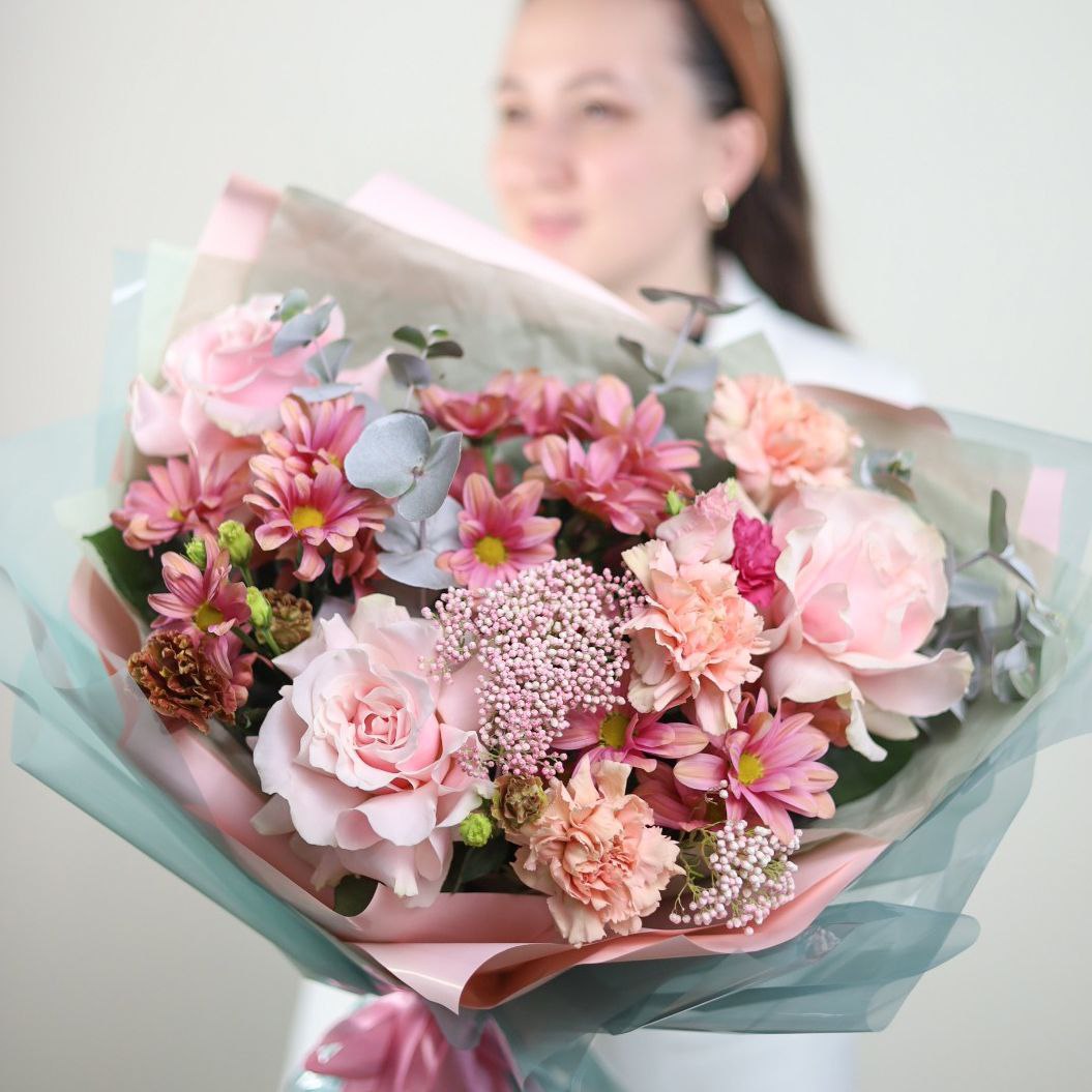 Букет в нежной гамме с французской розой, хризантемой, эустомой и озотамнусом в оформлении.